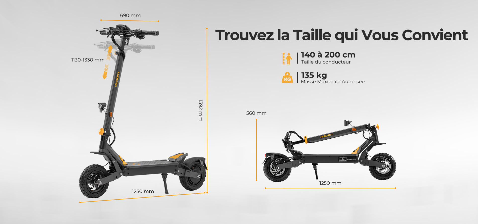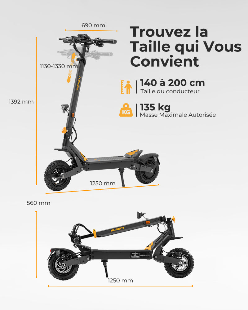 Le guidon réglable (1130–1330 mm) s'adapte aux utilisateurs mesurant entre 140 et 200 cm, garantissant une expérience de conduite confortable et personnalisée. Cette flexibilité rend la trottinette idéale pour un large éventail de riders sans compromettre la stabilité ni le contrôle.