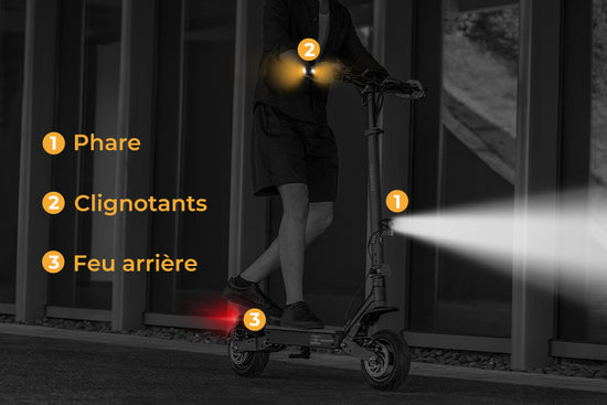 Un système d'éclairage LED complet à 360° — comprenant phare, clignotants et feu arrière — assure une visibilité optimale par faible luminosité et de nuit. Conçu pour la sécurité et la praticité, ce système intégré garantit votre visibilité et votre protection sous tous les angles.