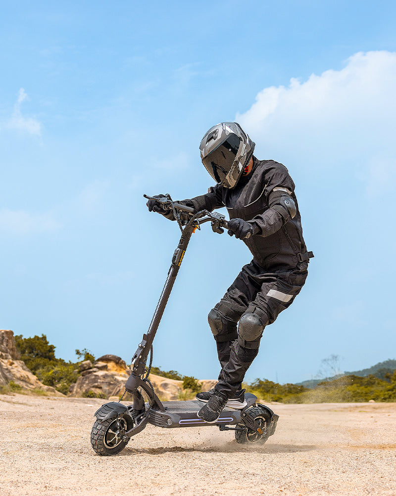Les deux moteurs sans balais de 1 000 W produisent une puissance maximale de 2 184 W, permettant une accélération rapide et une ascension facile des pentes raides. Que vous rouliez en ville ou dévaliez des sentiers rocailleux, la SR1 saura s'adapter avec une vitesse impressionnante pouvant atteindre 65 km/h. Choisissez entre les modes Eco, Sport ou Race en fonction de votre style de pilotage et du terrain.